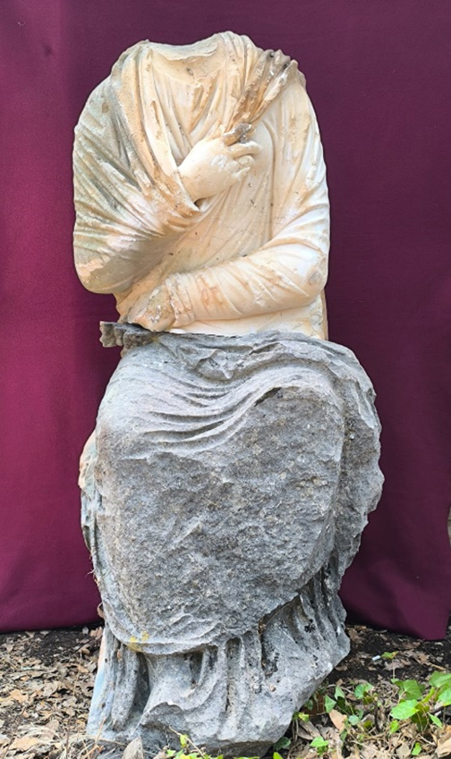 Termessos Antik Kenti'nde, E1 Nekropolü'nde ele geçen beyaz mermer kadın heykeli, minderli bir tabure üzerinde oturur vaziyette betimlenmiş, yaklaşık 137 santimetre yüksekliğiyle neredeyse gerçek insan boyutlarına ulaşan bir figürü yansıtıyor.