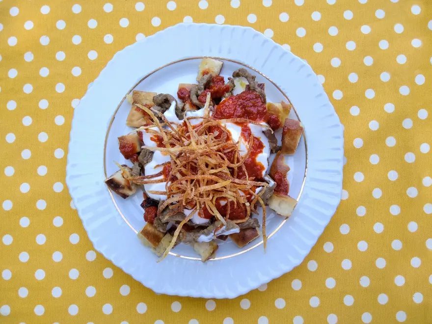 Milas-Bodrum yöresine özgü bu enfes kebap, kibrit inceliğinde kızartılmış patateslerin üzerine konulan marine edilmiş dana veya bonfile etinin, sarımsaklı yoğurt ve özel domates sosuyla buluşmasından doğuyor.