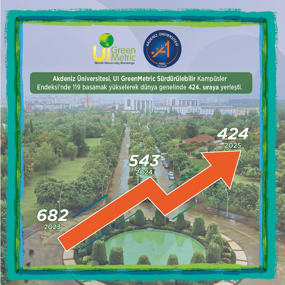 Dünya üniversitelerinin sürdürülebilirlik performansını altyapı, enerji, su yönetimi, atık, ulaşım ve eğitim gibi kapsamlı çevresel kriterler üzerinden değerlendiren prestijli bir uluslararası endeks olan UI GreenMetric’in 2025 sonuçları açıklandı. UI GreenMetric 2025 Dünya Üniversite Sıralamasında 105 ülkeden 1745 üniversite değerlendirildi. Sonuçlara göre Akdeniz Üniversitesi önemli bir başarıya imza atarak sıralamada 119 basamak birden yükseldi ve dünya üniversiteleri arasında 424'üncü sıraya yerleşti.
