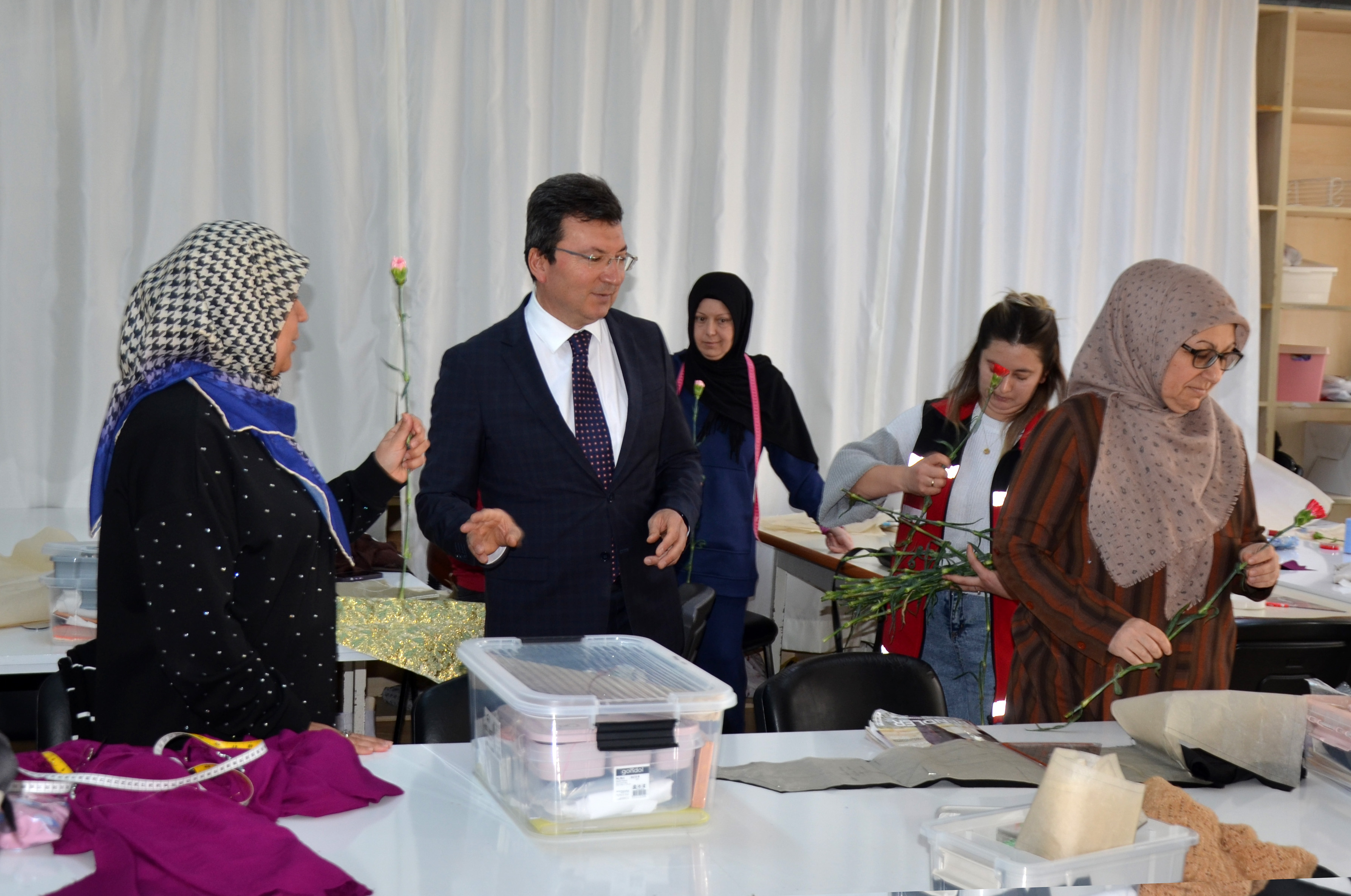 Kaymakam Cemal Şahin'e ziyaretinde İlçe Milli Eğitim Müdürü İkram Ekiz ve Halk Eğitim Merkezi Müdürü İbrahim Türkmen eşlik etti. Merkezde usta öğretici ve kursiyerlerle bir araya gelen Kaymakam Şahin, çiçek takdim edip, 8 Mart Dünya Kadınlar Günü'nü kutladı ve yaptıkları çalışmalar hakkında bilgiler aldı. Kaymakam Cemal Şahin, "8 Mart Dünya Kadınlar Günü dolasıyla kurumlarımızda görevli olan kadın çalışanlarımızı ve halk eğitim bünyesinde bulunan usta öğretici ve kursiyerlerimizi ziyaret ettik. Günlerini kutlayıp çiçek takdim ettik. Kadınlarımızın kıymet, değer açısından baş tacımız olduklarını vurguladık. Başta şehitlerimizin ve gazilerimizin anneleri olmak üzere bütün kadınlar baş tacıdır. Kadın annedir, eştir. Dünyada paha biçilmeyecek bir değerdir. Bu vesileyle kadınlarımızın 8 Mart Kadınlar Günü'nü kutluyor, hayırlı ramazanlar, sağlıklı uzun ömürler diliyoruz" dedi.