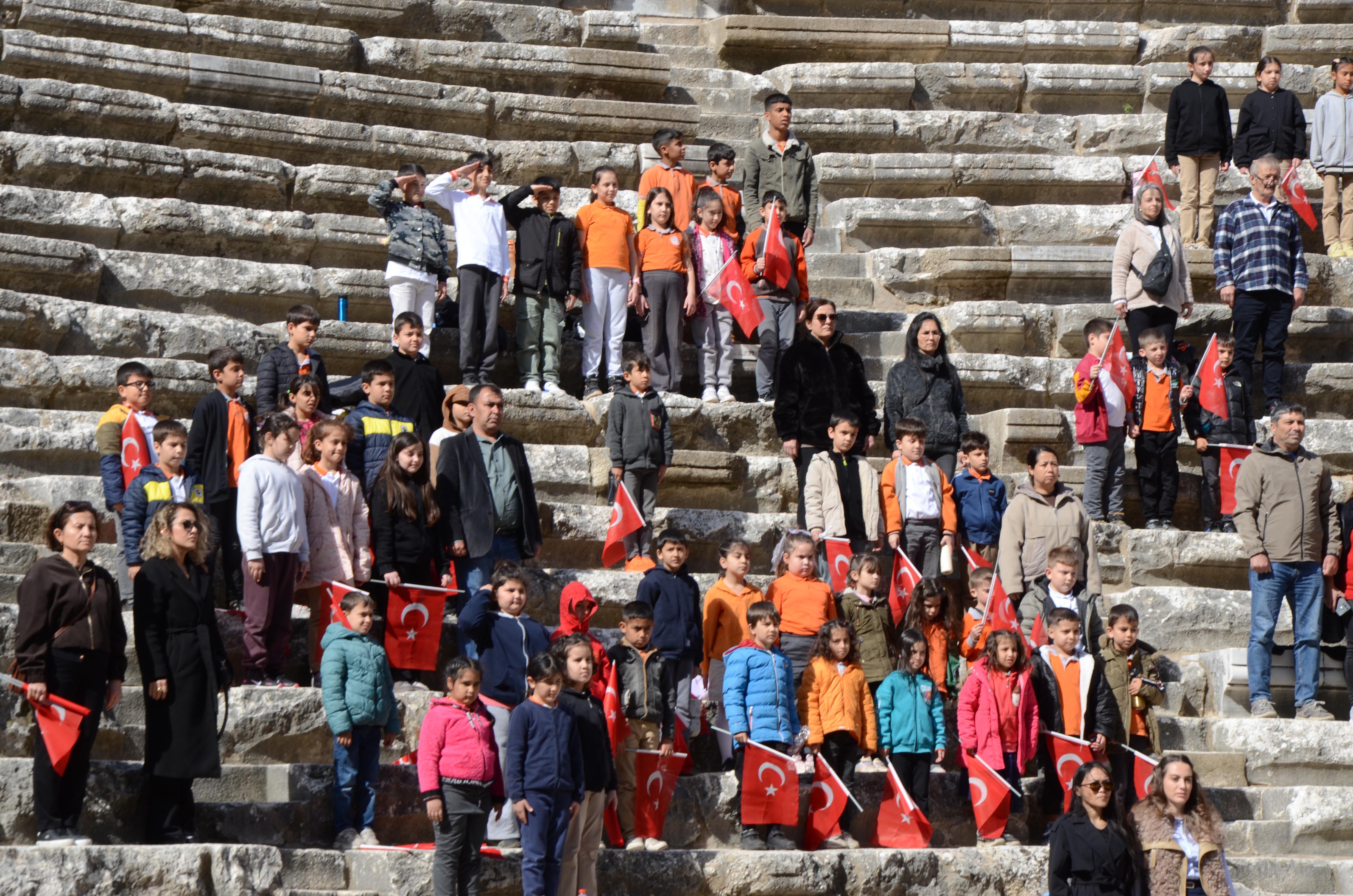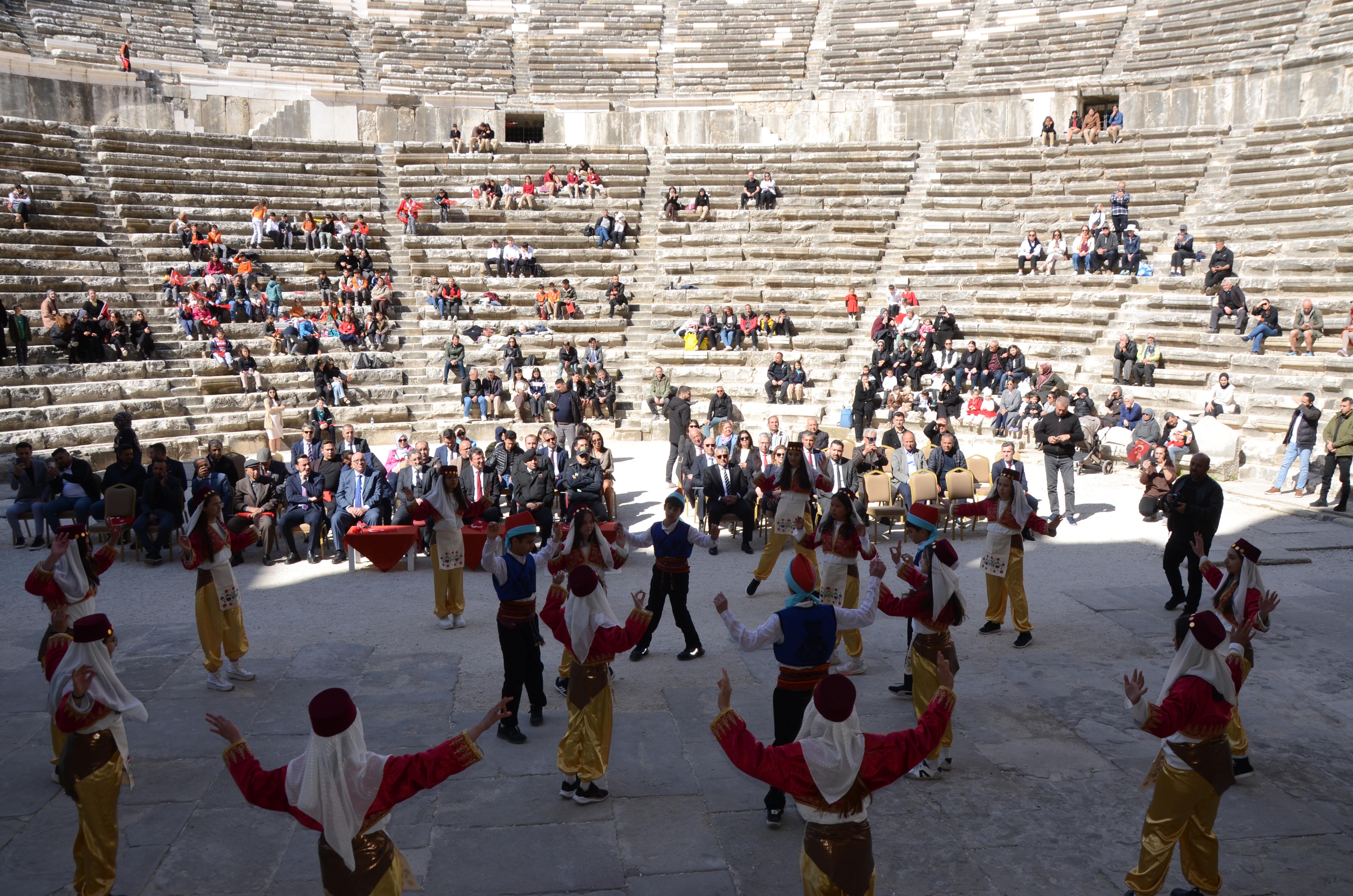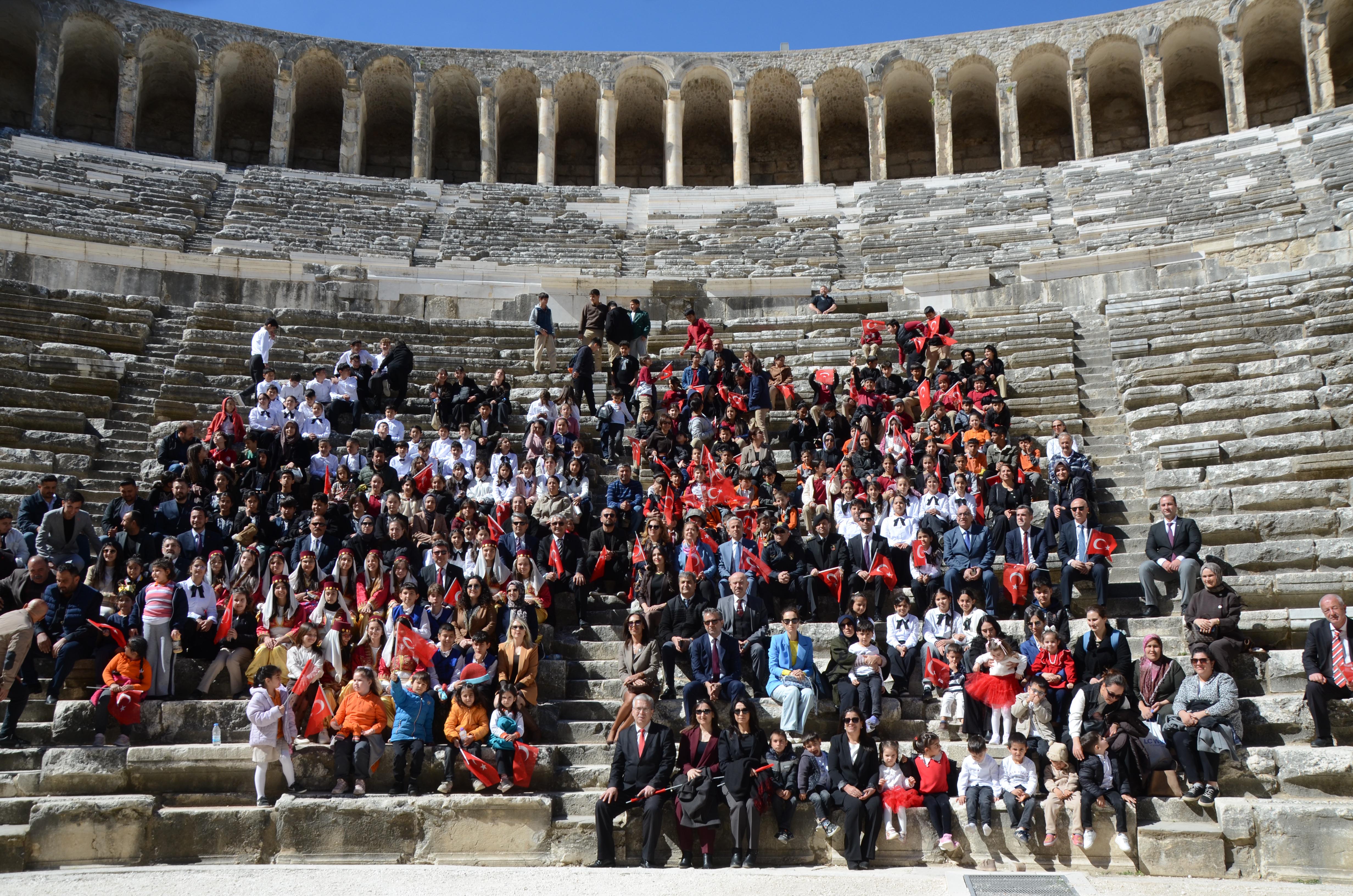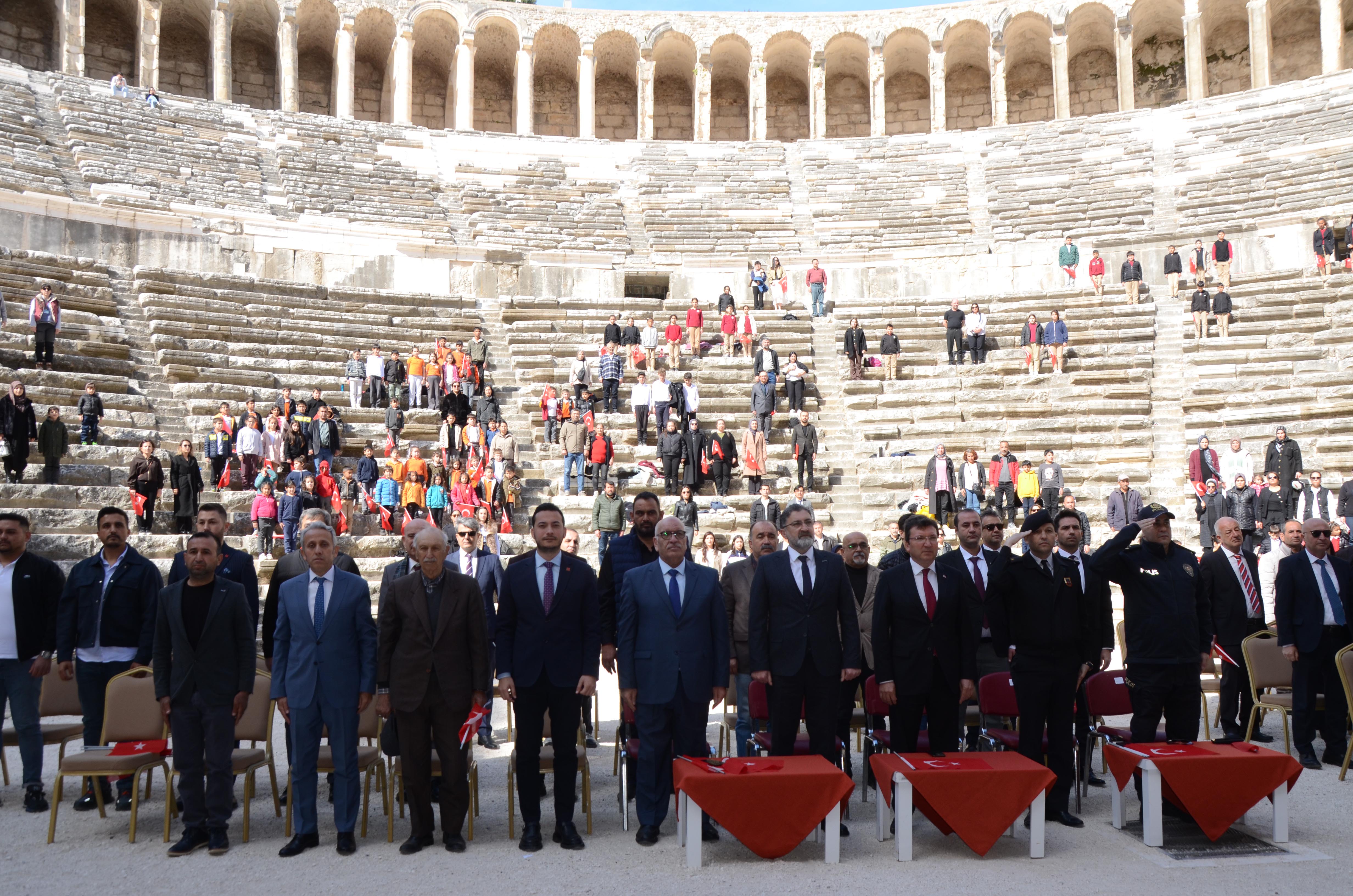 İlk Tören Cumhuriyet Meydanı'ndaki Atatürk büstü önünde saygı duruşu, İstiklal Marşı ve ardından çelenk sunumuyla başladı. Buradaki törenin ardından etkinlikler Tarihi Antik Aspendos Antik Tiyatrosu'nda devam etti. Antik tiyatrodaki törene Kaymakam Cemal Şahin, Belediye Başkanı Kadir Kumbul, İlçe Jandarma Komutanı Üsteğmen Ali Duman, İlçe Milli Eğitim Müdürü İkram Ekiz, kurum müdürleri, STK temsilcileri, öğretmenler, vatandaşlar ve öğrenciler katıldı.