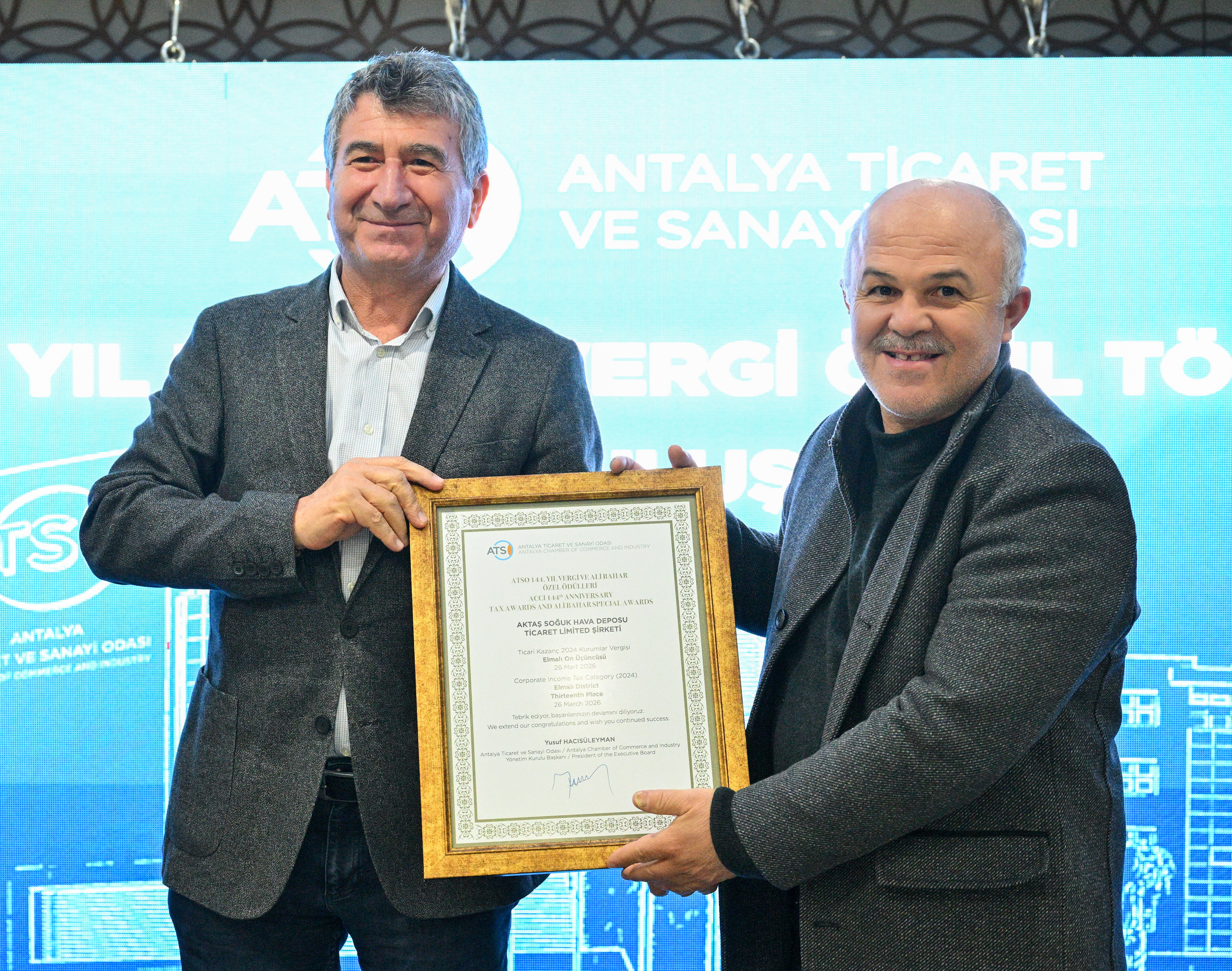 Antalya Ticaret ve Sanayi Odası (ATSO) Yönetim Kurulu Başkanı Yusuf Hacısüleyman ev sahipliğinde, ATSO 144. Yıl Elmalı Vergi Ödül Töreni ve Üye Buluşması gerçekleştirildi. Tören, Kaymakam Refiki Abdülbaki Cırık, Halil Öztürk, Elmalı Esnaf ve Sanatkârlar Odası Başkanı Hüseyin Aslan, ATSO Sayman Üyesi Murat Totoş, Yönetim Kurulu Üyeleri Hüseyin Sarı ve Mustafa Yayla, 2. Grup (Hayvancılık ve Hayvansal Ürünler) Meclis Üyesi Berkay Bahar, 6. Grup (Tarımsal Ürünlerin Ticareti) Meclis Üyesi Ali Demir, 9. Grup (Tekstil) Meclis Üyesi Osman Çoban, 33. Grup (Motorlu Taşıtlar AlımS atımı) Meclis Üyesi Muammer Ak, 24. Grup (Elektrik Enerjisi, Üretim, Dağıtım ve İlgili Hizmetler Faaliyetleri) Komite Başkanı Ayhan Çakır, sivil toplum kuruluşlarının temsilcileri ile ATSO üyesi iş insanlarının katılımıyla gerçekleşti. Törende, Elmalı ilçesinde 2023-2024 yılı ticari kazanç, kurumlar ve gelir vergisi kategorilerinde dereceye giren mükelleflere ödülleri takdim edildi.