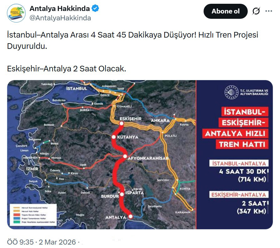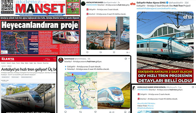 Güya iktidar, Antalya’ya hızlı treni getiriyordu. Üstelik İstanbul-Antalya arası 4.5 saate düşecekti. Sanki, İstanbul-Antalya arasında hızlı tren vardı, 5-6 saatte geliyordu da, şimdi 4.5 saate düşecekti. Oysa Antalya’da döşenen tek bir tren rayı yoktu. Antalya dışına çıkmayan hiçbir Antalyalı hayatında hızlı tren görmemişti. Peki, nasıl oluyordu da, İstanbul-Antalya ve Eskişehir-Antalya yolu kısalıyordu.