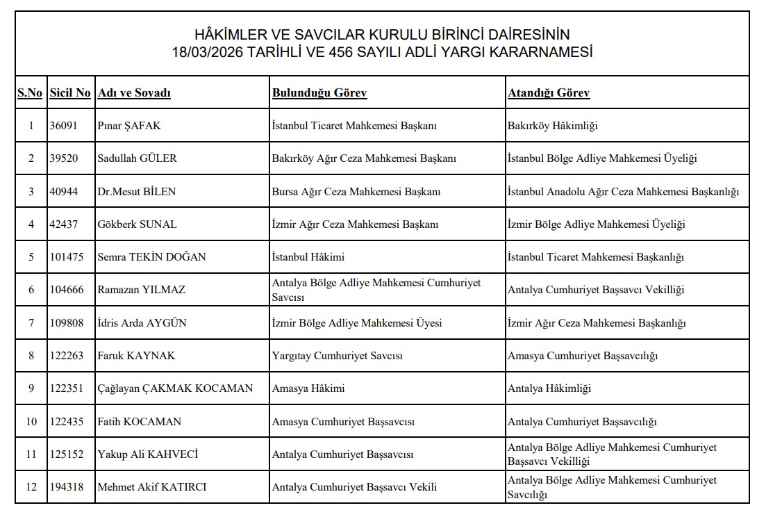 HSK Birinci Dairesi’nin 18 Mart 2026 tarihli ve 456 sayılı Adli Yargı Kararnamesi kapsamında çok sayıda hakim ve savcının görev yeri değiştirildi. Kararnameye göre, Antalya yargı teşkilatında önemli görev değişiklikleri gerçekleştirildi. Antalya Cumhuriyet Başsavcısı Yakup Ali Kahveci, Antalya Bölge Adliye Mahkemesi Cumhuriyet Başsavcı Vekilliği görevine atanırken, Amasya Cumhuriyet Başsavcısı Fatih Kocaman, Antalya Cumhuriyet Başsavcılığı görevine getirildi.