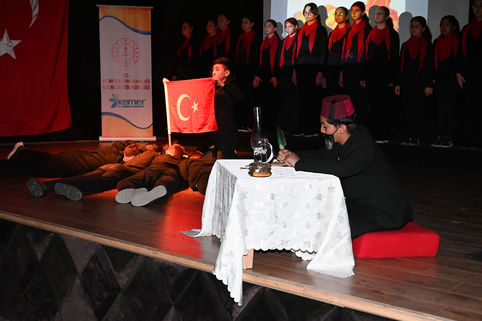Kemer Kaymakamlığı himayesinde, Kemer Belediyesi ve Kemer İlçe Milli Eğitim Müdürlüğü'nün destekleriyle Rukiye Koç Ortaokulu tarafından düzenlenen 12 Mart İstiklal Marşı'nın Kabulünün 105. yıl dönümü ve Mehmet Akif Ersoy'u Anma programına, Kaymakam Ahmet Solmaz, Kemer Belediye Başkan Vekili Mustafa Çelik, Kemer Cumhuriyet Başsavcı Vekili Serhat Çaylak, Kemer Jandarma Komutanı Ömer Seyhan, Kemer Belediye Başkan Yardımcısı Mehmet Derya Baytekin, Kemer Belediye Meclis Üyesi Mehmet Akın, Kemer İlçe Milli Eğitim Müdürü Mehmet Erkan Ergen, siyasi parti temsilcileri, muhtarlar, öğretmen ve öğrenciler katıldı.