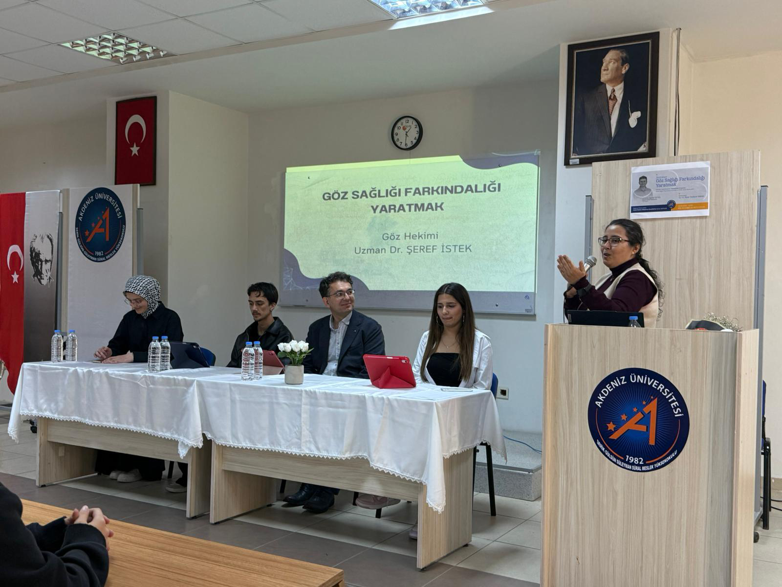 Optisyenlik Programı müfredatında yer alan TDP 34 Toplumsal Duyarlılık ve Katkı dersi kapsamında Göz Sağlığı ve Doğru Görme Gereci Seçimi ile Kullanımı Farkındalık Projesi semineri proje sözcüsü Deniz Oğuz ve toplumsal duyarlılık ve katkı dersi öğrencilerinin katkılarıyla organize edildi. Proje danışmanı öğretim görevlisi Ayşe Yadikar Habalı tarafından yürütülen seminere davetli konuşmacı olarak Kepez Devlet Hastanesi göz hekimi Uzman Dr. Şeref İstek katıldı. Dr. İstek, göz sağlığı ile ilgili doğru bilinen yanlışlar, önleyici yaklaşımlarla göz sağlığının korunması, göz sağlığı ve beslenme ilişkisi, sık karşılaşılan görme bozuklukları ve göz hastalıkları, belirtiler ve erken teşhisin önemine dikkati çekti.